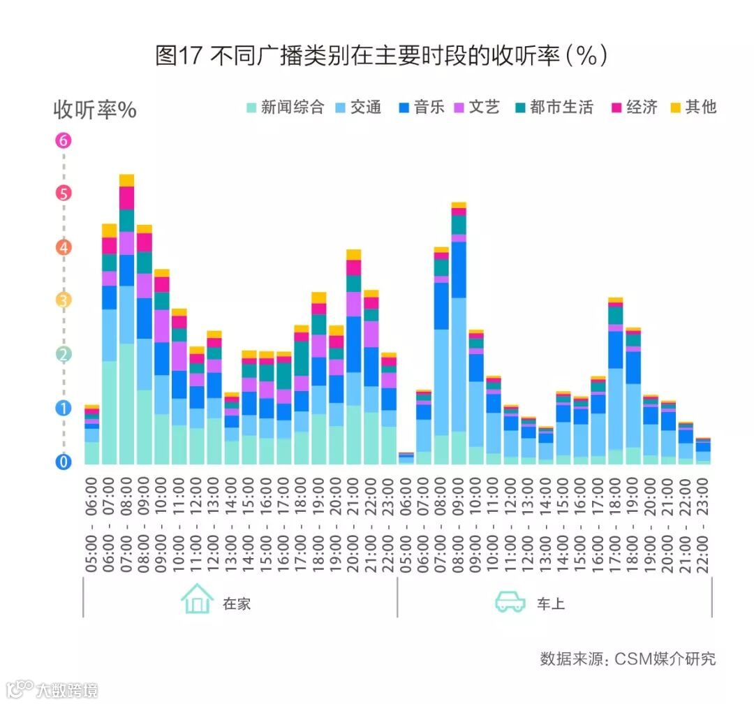 资讯类频率/节目引领早晚高峰时段特别是车上收听市场,非交通类频率谈话节目更容易形成夜间收听高峰