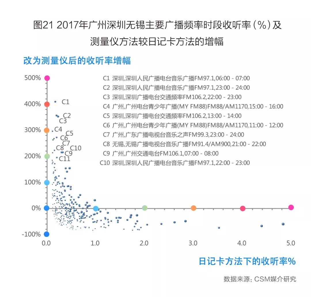 从具体频率时段的收听率数据来看,在采用测量仪收集的数据中,原收听率较高时段的收听率均有一定程度的降低,但对于原收听率较低的时段来说,其收听率却有大幅度的提升,以深圳的深圳人民广播电台音乐广播FM97.1之06:00-07:00时段、广州的广州电台青少年广播(MY FM88)FM88/AM1170之15:00-16:00时段、深圳的深圳广播电台交通频率FM106.2之13:00-14:00时段、广州的广州电台青少年广播(MY FM88)FM88/AM1170之11:00-12:00时段、无锡的无锡广播电视台音乐广播FM91.4/AM900之21:00-22:00、广州的广州交通电台FM106.1之07:00-08:00时段和广州的广州电台青少年广播(MY FM88)FM88/AM1170之17:00-18:00时段为例,其测量仪数据收听率较日记卡数据收听率的提升幅度超过了两倍,深圳人民广播电台音乐广播FM97.1之06:00-07:00时段收听率的升幅更是达到了四倍。