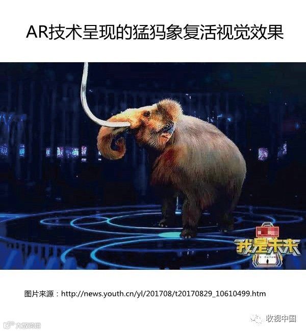通过对目前最为前沿的科技和产品的展现,让观者看到科技与我们的距离有多近,看到科技能够给我们现在的生活带来多大的便利和改变。从节目展现的效果来看,《我是未来》更倾向于对于前沿科技实际应用的视觉展示。在某期节目中,深圳华大基因股份有限公司CEO尹烨在讲演DNA技术能够实现复活猛犸象的时候,通过AR(增强现实)技术的呈现,观众真的看到一头活灵活现的猛犸象出现在舞台上,这种视觉效果的震撼是观众通过屏幕观看时不能企及的。