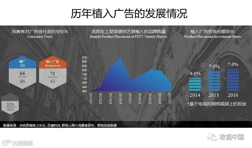 消费者对广告信任度发生了变化,植入广告的信任度从2013年到2016年有很大的提升。据群邑统计,2014年到2015年,电视和网络视频上植入广告的投放份额上升很快。2016年以后,头部媒介资源比较饱和,植入广告的份额出现了停滞。
