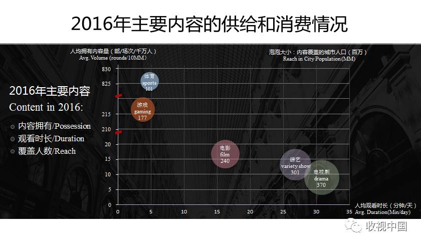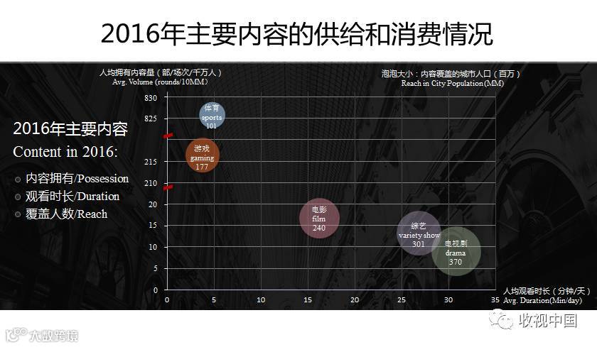 从需求侧和供给侧看现在的市场情况,图中纵轴是内容的人均拥有量,横轴是人均观看时长,圆圈大小是每天可以覆盖的城市人口数量。