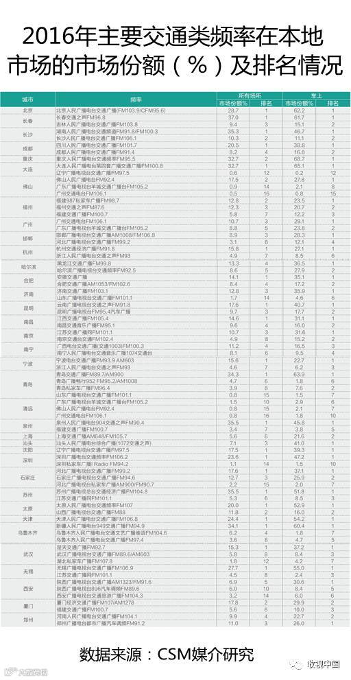 而在“车上”,交通类频率竞争力优势凸显,在全国36个城市中,有32个城市车上市场份额排名首位的都是交通类频率,有55个频率进入当地市场份额排名的前三位,占了前三位总席位量的一半以上。而在“车上”收听市场份额超过60%的频率有重庆人民广播电台交通频率FM95.5、大连人民广播电台第四套广播交通广播FM100.8、青岛交通广播FM89.7/AM900、北京人民广播电台交通广播(FM103.9/CFM95.6)、长春交通之声FM96.8和新疆人民广播电台949交通广播FM94.9。