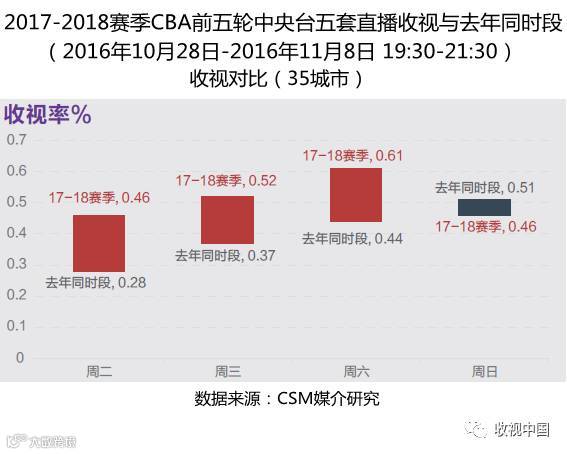 新赛制在收视率方面收效显著。10月28日开赛以来,截至11月8日,CBA进行了五轮比赛,中央台五套直播了其中的7场,35城市平均收视率为0.5%。除周日略有下滑外,各周天的收视率与去年同时段相比都有大幅上涨。