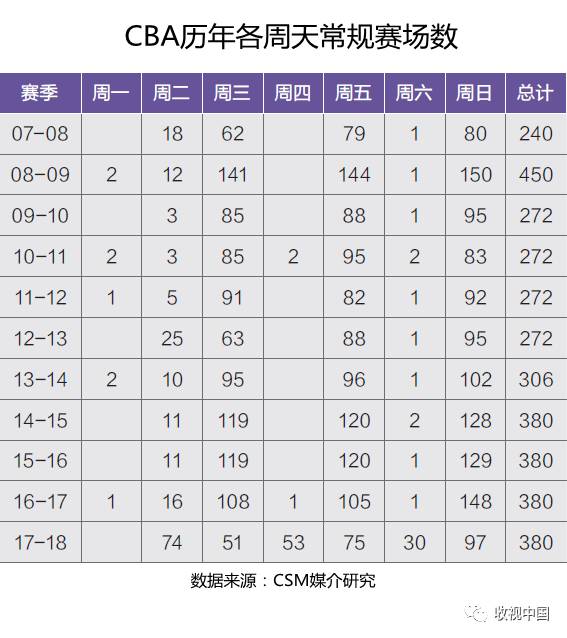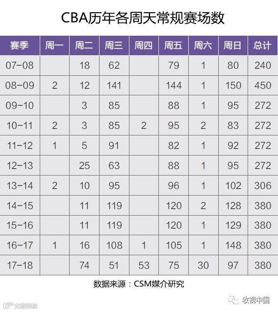 新的赛季CBA采用了全新的赛程安排。往年的比赛都集中在每周的三个比赛日即周三、周五和周日, 本赛季CBA将比赛更平均的分配到了六个周天。其中周四作为“新媒体独播日”(不会在央视转播)安排了53场比赛, 足见CBA对拓展新媒体渠道的诚意。
