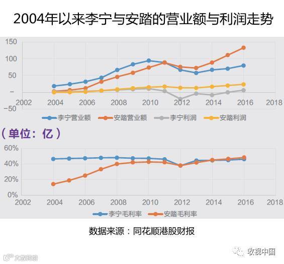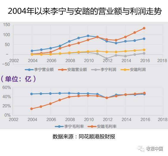 2004年11月,离开了IMG后连年亏损的篮管中心迎来了“雪中送炭”的安踏,结束了CBA球衣“百家争鸣”的时代,同时也开启了双方长达8年的合作。在这八年中,安踏的营业额几乎呈直线上升。2011年安踏以89亿的营业额追平李宁,随后在2012年成功反超,而在一切刚刚开始的2004年,李宁的营业额是19亿,是安踏同年营业额(3亿)的6倍。和营业额一同飙升的还有安踏的毛利率,从2004年的14%直线增长到2008年的40%,从财务数据的角度来看,安踏在赞助CBA的八年间已经成功的站稳了脚跟,树立了自己的品牌形象。