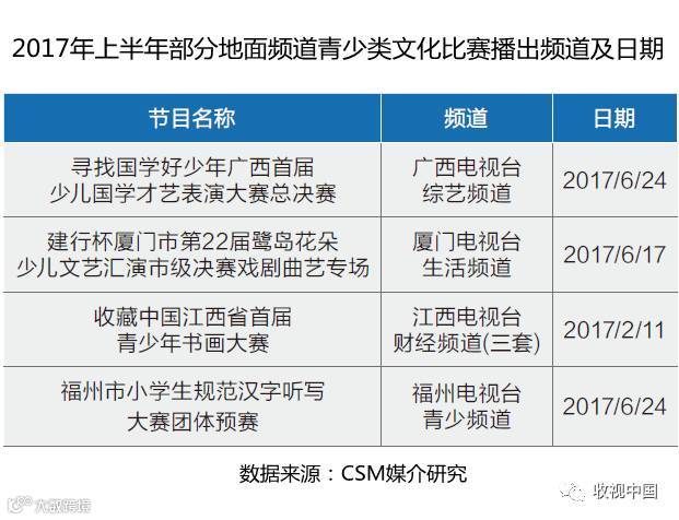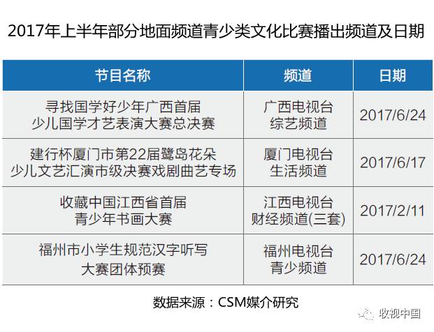 青少类节目一直都是地面频道吸引本地电视观众参与线下互动的节目类型,但许多节目的收视表现不太理想。自2016年文化类节目火热后,以文化为主题的少儿才艺比赛活动也在许多地面频道纷纷出现。比如广西综艺频道的少儿国学才艺表演大赛、江西财经频道的青少年书画大赛、厦门生活频道的少儿文艺汇演戏剧曲艺专场、福州青少频道的福州市小学生规范汉字听写大赛等。