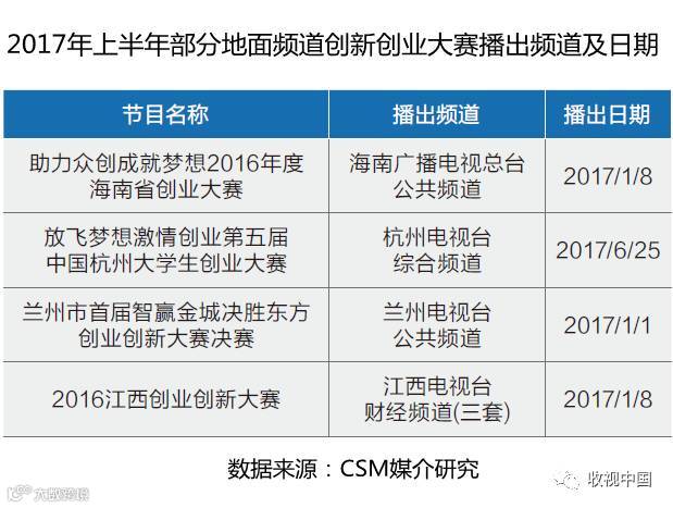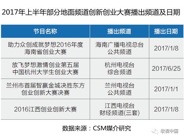 海南省2016年的创业大赛决赛在经历了三个多月的比拼后,于17年1月进行了最后的决赛,并在海南台公共频道播出。杭州、兰州、江西等地也有不同的创业创新大赛在当地地面频道播出。电视媒体多层次全方位的宣传,有效的提升大赛的影响力和知名度。