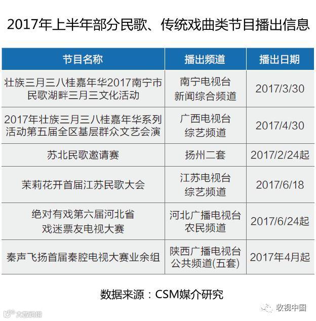 中老年观众是许多地面频道的重度观众,民歌、戏曲节目也是他们喜闻乐见的形式。2017年上半年,广西壮族的三月三歌节、江苏的民歌赛事、河北陕西等地的传统戏曲节目等多档节目的收视表现突出。