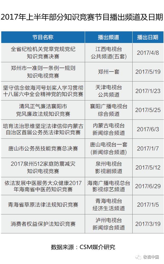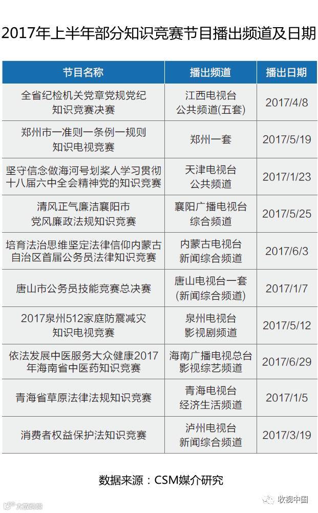 电视媒体作为重要的宣传教育窗口,也承担了许多相关党员教育知识竞赛节目的制作与传播工作。比如去年下半年播出的湖南经济频道“好好学习湖南省两学一做电视知识竞赛”在长沙市场平均收视率达到2.6%,2017上半年播出的相关节目主要包括:江西公共频道播出的“全省纪检机关党章党规党纪知识竞赛”、襄阳电视台综合频道播出的“襄阳市党风廉政法规知识竞赛”、天津公共频道播出的“坚守信念做海河号划桨人学习贯彻十八届六中全会精神党的知识竞赛”等。