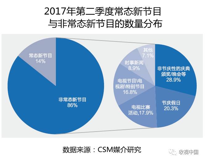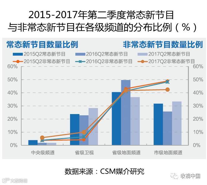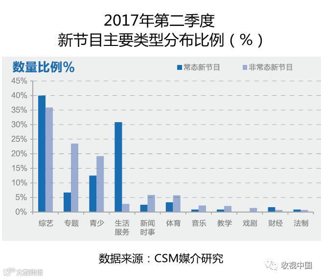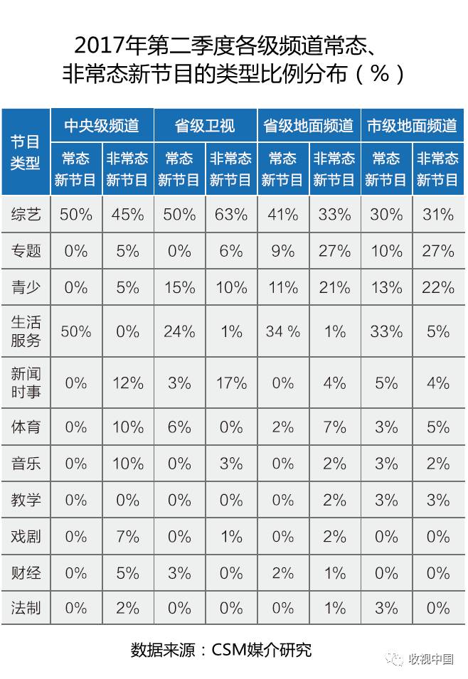 2017年第二季度,综艺、专题和青少类节目仍然是各级频道创新最为集中的三大类型,其中综艺节目在常态新节目中的占比达到四成,是电视节目创新最热点领域。