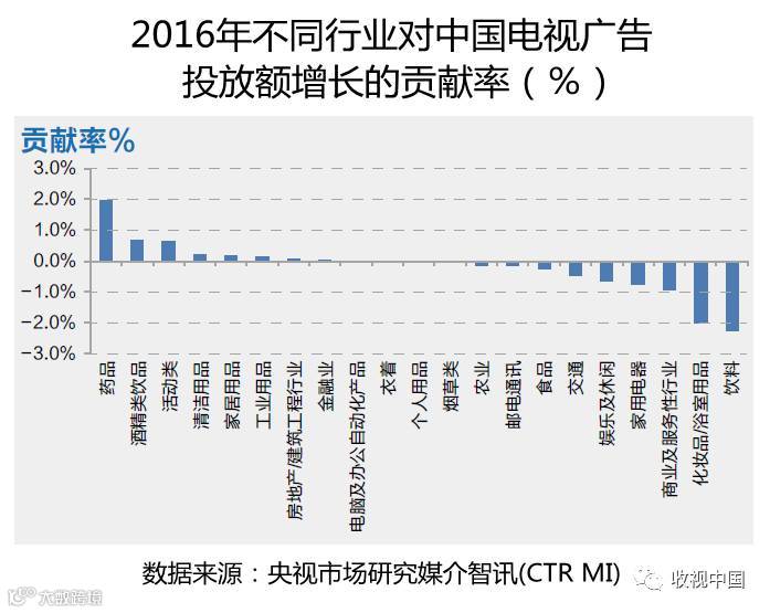 2016年中国电视广告投放额同比2015年有所下降,21个行业中9个增长、12个下跌。各行业对电视广告增长的贡献率与往年相比发生了一些变化,药品行业贡献率仍然表现突出,而饮料、化妆品/浴室用品等行业贡献率呈现较大负值。