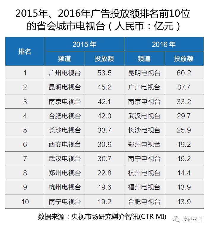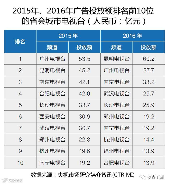 在省会城市台广告投放额前十名排行榜中,大多数电视台的广告投放额均出现了不同程度的下滑;长期排名第一位的广州电视台下跌为第二,昆明电视台上升到首位。