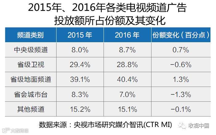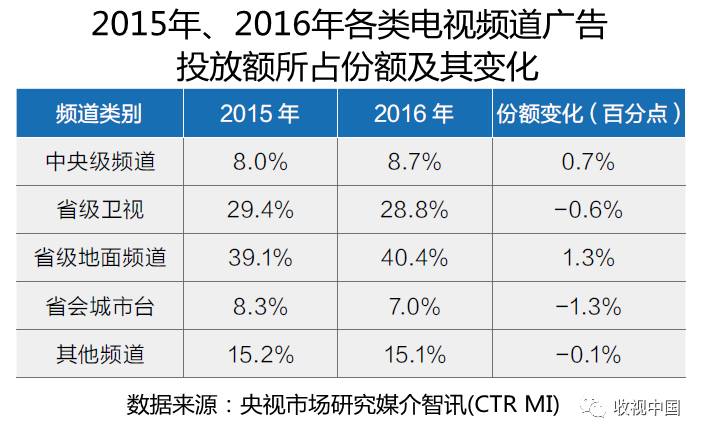 2016年各类电视频道广告投放的竞争中,中央级频道份额同比2015年增加0.7个百分点;省级卫视频道同比下降0.6个百分点;省级地面频道同比上升1.3个百分点;省会城市台同比下降1.3个百分点。