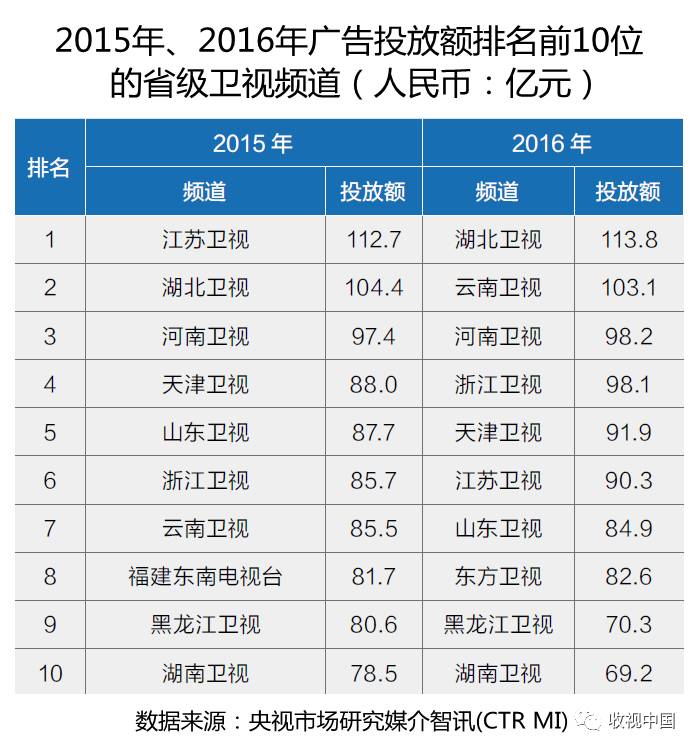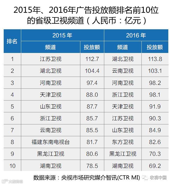 2016年省级卫视广告投放额排名TOP10的频道中,湖北卫视、云南1套和河南1套二、三线卫视占据排名前三位,而长期排名靠前的湖南、江苏、浙江等一线卫视排名下滑,这可能与数据统计口径有关。央视市场研究媒介智讯数据只统计硬广告刊例价。此文涉及的广告投放额以媒体公开报价为统计标准,不含折扣。