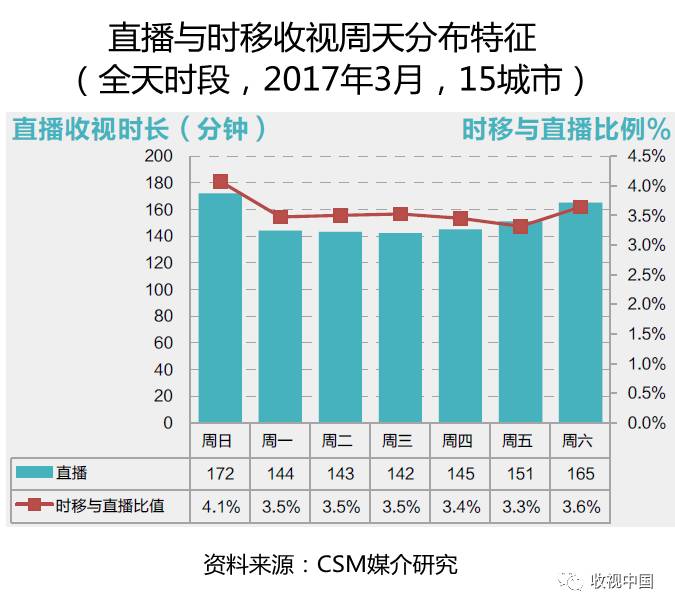 CSM媒介研究在2015年启动了符合国际标准的时移收视测量服务,对节目播出7日内观众通过点播和回看进行的时移收视进行测量。目前按周提供15个城市的时移收视数据,这15个城市分别是上海、北京、天津、广州、南京、成都、杭州、西安、郑州、济南、长沙、乌鲁木齐、合肥和银川。CSM媒介研究郑维东副总经理认为,影响时移收视率水平的因素有若干,其中一是双向互动用户的渗透率,二是运营方提供节目点播和回放的类型、时效及容量,三是观众在点播和回放方面收视习惯的养成程度。