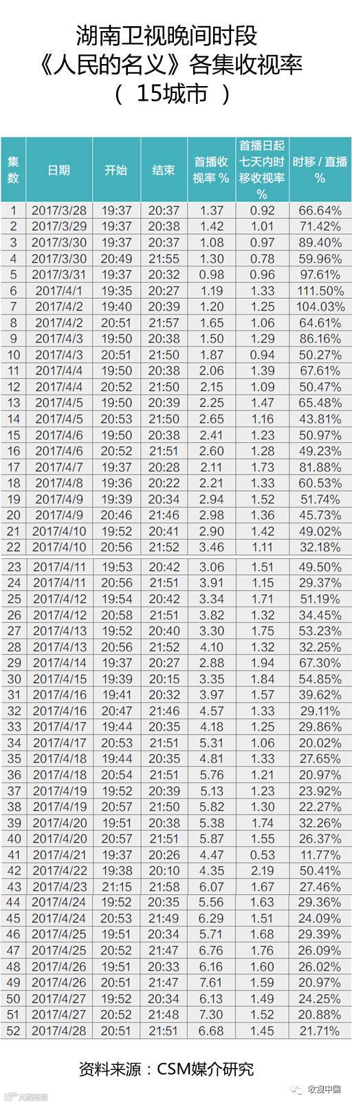 时移收视对电视频道的观众增量,在节目收视数据中,有更为典型的体现。以2017年4月份热播的电视剧《人民的名义》为例,其在15城市收视率逐日走高,直播收视率在播出第三十天达到第49集的7.61%的最高值,在时移收视方面,3月31日至4月2日期间的第5、6和7集的时移收视与直播收视的比值分别达到97.61%、111.50%和104.03%,也就是说,这三集的时移观众量达到或超过了其直播观众量。这一现象对于电视剧独播权所有者、时移服务提供商、OTT运营商以及节目版权公司无不具有巨大的鼓舞和启发,正确的投资决策和严谨播出控制,不仅能让投资者和经营者在直播收视热潮中获得高收益,还可以在延续的时移收视市场获得增值的经营回报。