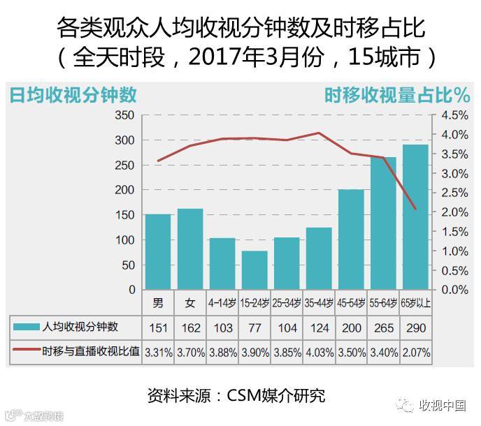 传统电视的观众收视特征是收视率随观众年龄增长而增长,原因是中老年人群、特别是老年人群,其用于收看电视的闲暇时间较中青年人群更多,而青少年和中青年观众,忙于紧张的学习和工作、以及媒介消费的多样化,其电视直播收视率水平明显低于老年人群。时移收视量与总收视量比值显示,15-44岁人群的时移与直播收视比值最高,且这一数值随观众年龄增长而明显降低。