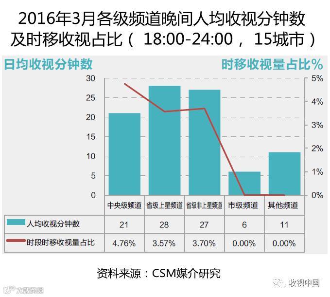 2016年3月份晚间时段数据显示,在15城市,中央级频道、省级上星频道和省级非上星频道晚间时段的人均日收视分钟数分别为21、28和27,三类频道时移收视量占比分别为2.81%、3.57%和3.70%。