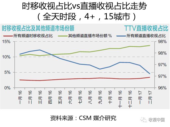 时移收视数据的变化,能够很好地反映当今电视乃至视频媒体传输及其收视方式的演进,即电视节目不再局限于直播传输、观众被动收视,而是迎来了一个可以重复传输、观众时移收视的全新时代。2016年1月以来所有电视频道时移和直播收视数据显示,直播收视在总收视中的占比呈现降低趋势,而时移收视占比则从2016年1月份的2.6%稳定增长到2017年1月份的3.0%,这也从一个侧面解释了市场上“其他频道”市场份额自2016年1月份以来的明显增长。