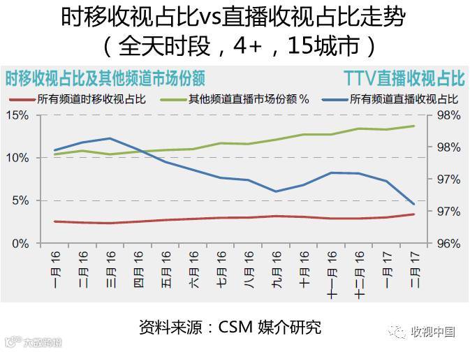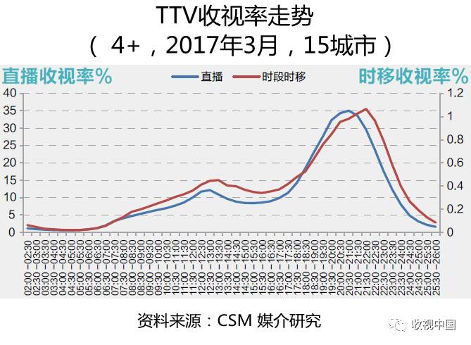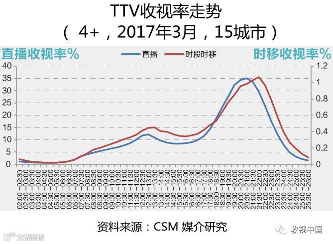 由于时移收视一般是对直播结束后节目的收视,因此时移收视高峰也较直播收视最高峰延迟出现,2017年3月份数据显示,在15城市,TTV时移收视率高峰较直播收视率高峰推迟一个小时出现。