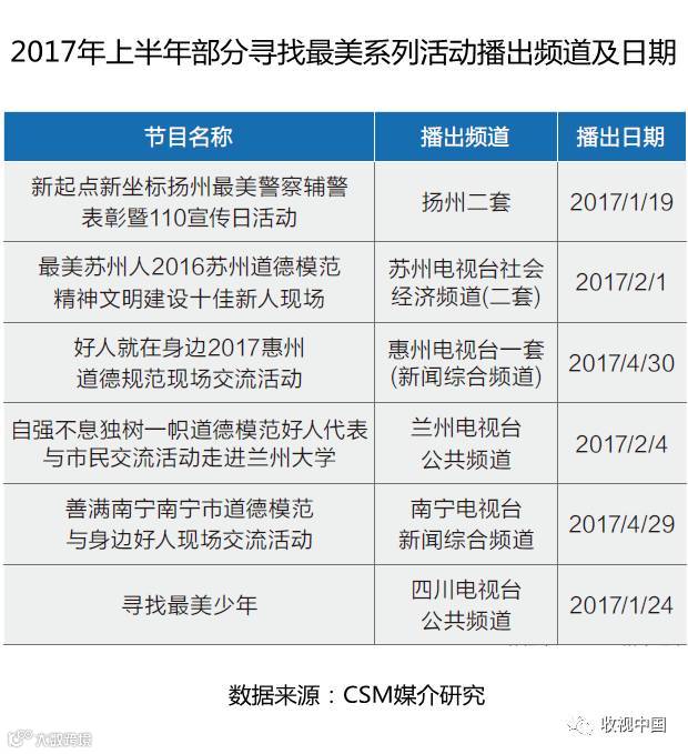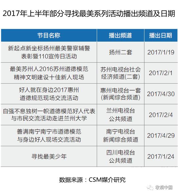 2012年下半年由中央电视台主办的"寻找最美"系列大型公益活动陆续登陆电视荧屏,最美孝心少年、最美乡村教师、最美乡村医生、最美消防员等寻找最美活动感动着无数电视观众。地方电视台也都推出了类似的寻找最美活动,部分品牌活动已经举办多年,并持续保持着良好的口碑和收视表现。