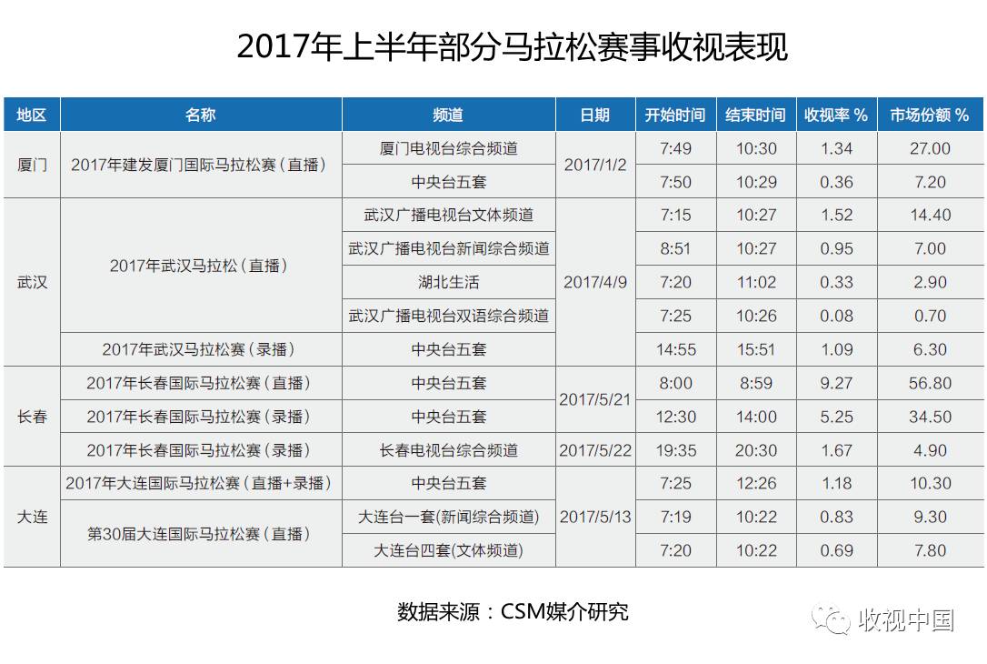 2017年首次举办的长春国际马拉松更是吸引长春观众的极大关注,5月21日上午8至9点一小时的播出时间里,中央台五套在长春地区的平均收视率为9.27%,同时段份额56.8%,下午时段播出实况录像的收视率也达到5.25%,同时段份额35.5%。本地地面频道中,长春电视台综合频道在隔日晚间时段播出的节目收视率为1.67%,同时段份额4.86%。如果地面频道能够获得赛事的直播权,或许能取得更优异的收视表现。