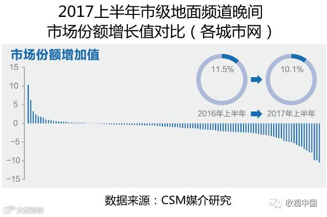 而城市台的下滑尤为明显,在116个城市调查网中,市级频道整体份额从11.5%下滑到10.1%,其仅在25城上涨,在91城呈现下跌,市级频道市场份额降低的城市数接近八成。