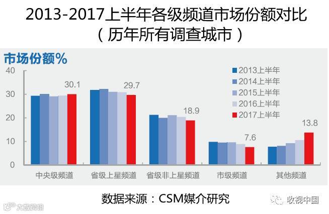 全国各级频道组“三足鼎立”的竞争格局未变,央视、省级卫视和地面频道各占30%左右的市场份额,但其中突出的变化是,其他频道组的市场份额持续上扬,2017年上半年其涨幅更是五年来之最,其市场份额甩开了市县级频道,达到13.8%。