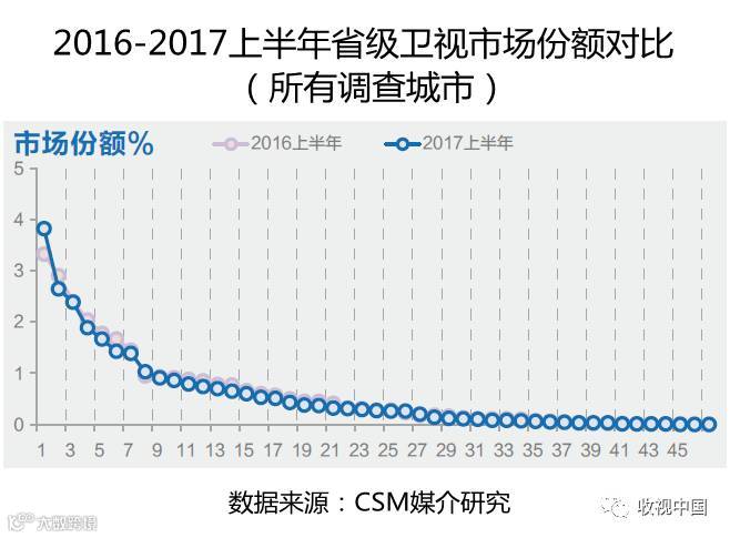 2017上半年,省级卫视竞争力依然呈现阶梯式分布,第一阵营除了排在头名的卫视份额有所提升外,其他卫视均有下降。第2-7名的份额相比去年同期均有所下降,其与排名第一的频道的差距被进一步拉大,第二梯队尝试冲击前列的难度越来越大;2017年上半年份额超1%的省级卫视有8个,排名第8位的份额有所提升,成功晋级第一梯队,成为唯一一个跨入第一阵营的省级卫视;第9-15位的省级卫视份额继续下降,省级卫视竞争分化进一步加剧,弱势省级卫视弯道超车的概率越来越小。