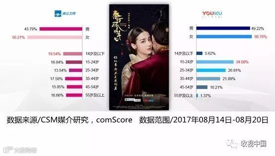 在电视端,《秦时丽人明月心》的女性观众比例明显高于男性,为56.21%;从年龄分布上看,该剧在各个年龄层的分布相对平均,其中14岁及以下的观众比例最高,为19.54%;在PC端,该剧在优酷网的男性观众比例和女性观众比例相差不大,分别为49.22%和50.78%,与电视端略有不同;从年龄分布上看,15-24岁的观众为该剧在优酷网的主要收视人群,为34.00%,与电视端形成差异。