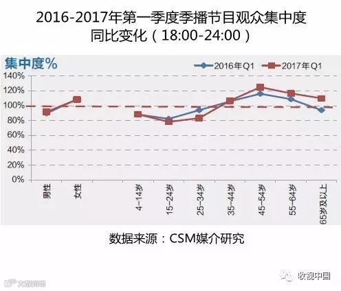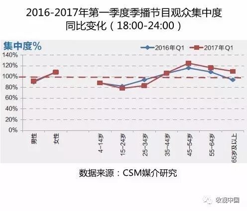 2017年第一季度,4岁及以上所有人收看上星频道晚间季播节目的收视率为0.6%,同比下滑近0.1个百分点,其中除65岁及以上观众略提升0.02个百分点外,其他观众收视率均同比有所下滑。35岁及以上观众是晚间季播节目的重度观众,相比2016年同期, 45岁及以上观众集中度同比有所提升,15-34岁年轻观众集中度有所降低,尤其是25-34岁观众集中度同比降幅达到11.5%。