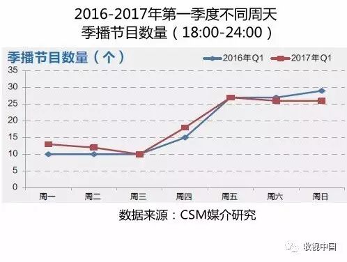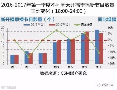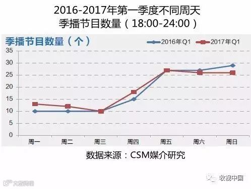 与2016年同期相比,2017年第一季度新开播的季播新节目,周四同比8%的增幅与其他周天拉开较大差距,如山东卫视《超级惊喜》、深圳卫视《为梦想加速》均获得较高收视率,高于周四晚间新开播节目0.29%的平均收视率。此外,虽然周六晚间季播节目总量同比减少,但新开播的节目数量却同比增长近6%,其中浙江卫视《我们十七岁》、上海东方卫视《中国式相亲》、中央台三套《全家好拍档》等节目收视率均高于同周天新开播节目0.58%的平均收视率。考虑到周末晚间时段的天然优势,在盈与亏的抉择中,工作日和周末双管齐下,不失为一种理性选择。
