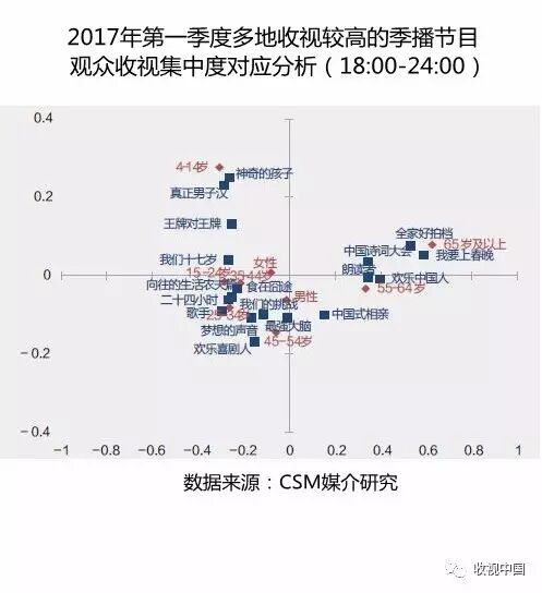 季播节目从之前的大众乐,发展到目前针对特定目标观众群的分众定位,只要抓准核心受众,还是能获得相对较高的竞争力。简言之,能基本满足不同观众收视需求的季播节目,在多地收视还是相对较高的。2017年第一季度,在40个以上城市都能进入同时段收视率TOP20的季播节目[3]中,《神奇的孩子》、《真正的男子汉》、《王牌对王牌》更受青少年观众关注;《全家好拍档》、《中国诗词大会》、《我要上春晚》、《朗读者》以中央台播出为主的节目收视则更集中在55岁及以上老年观众中;《我们的挑战》、《最强大脑》、《歌手》等综N代和创新形式的《向往的生活农夫篇》、《食在囧途》、《梦想的声音》等得到中青代青睐。