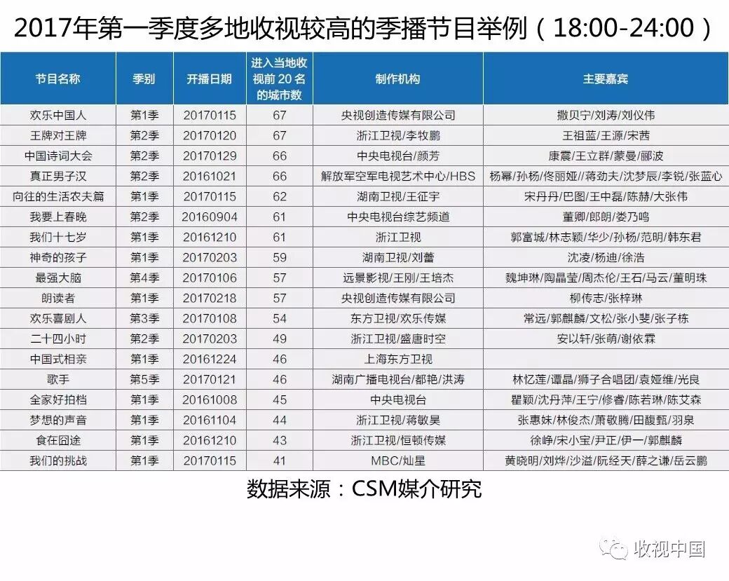 [3] 节目选取:71分城市,2017年1月1日-3月31日,上星频道晚间18:00-24:00时段播出的季播节目,进入当地同时段季播节目收视率TOP20的城市数超过40个的季播节目。
