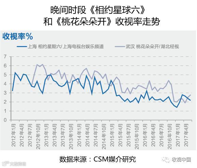收视数据显示,上海电视台娱乐频道的《相约星期六》和湖北经视的《桃花朵朵开》的收视率均经历了自2012年以来的在波动中逐渐走低的过程,直到2017年1月份同步出现了触底反弹。