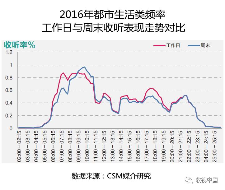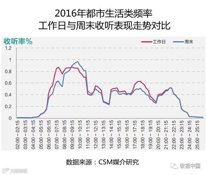 2016年都市生活类频率工作日与周末全天收听表现整体走势大致相似,全天有多个收听高峰出现,收听峰值均出现在早间时段。相比工作日,周末早间收听高峰时段出现较晚,全天最高峰值收听率为0.97%,其他时段收听表现大多低于工作日。