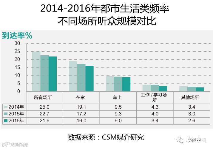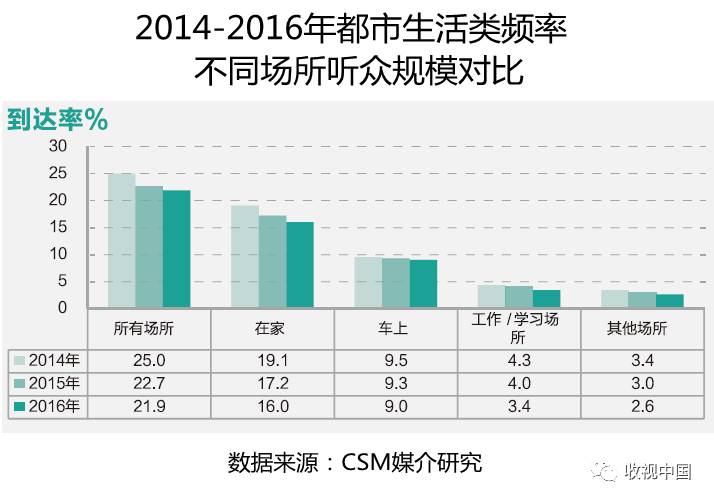 近三年来,都市生活类频率听众规模呈现逐年递减趋势,整体听众到达率从2014年的25%,下滑至2015年的22.7%,直至2016年的21.9%,三年之间共下滑了3.1个百分点。以三年平均推及人口约9500万人推算,三年之中共有约300万的听众流失。从不同场所听众规模对比来看,各个场所都呈现下滑的趋势,收听主要场所“家中”听众流失规模最大,2016年为16%,相比2014年的19.1%下滑了3.1个百分点;“车上”和“工作/学习场所”相比2014年分别下滑了0.5和0.9个百分点,“其他场所”下滑0.8个百分点。