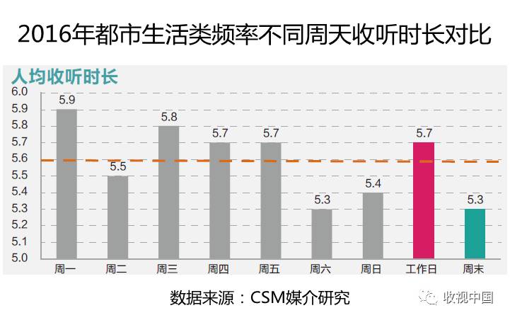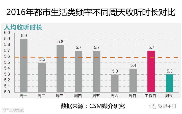 从2016年36城市都市生活类广播所有场所不同周天人均收听时长对比来看,周一收听表现相对最好,人均收听时长为5.9分钟;周三其次,为5.8分钟,周四和周五的收听量基本持平,在5.7分钟左右;周二受到部分广播台常规设备检修影响,收听量有较大下滑,人均收听时长在5.5分钟左右,周六和周日相对更低,分别为5.3和5.4分钟。都市生活类频率工作日整体人均收听时长为5.7分钟,比周末高0.4分钟。