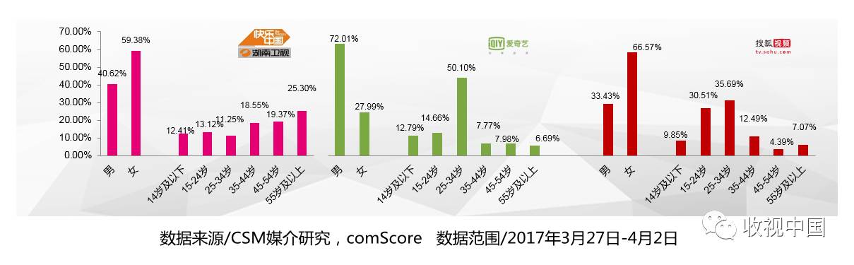 在电视端,《人民的名义》的女性观众比例明显高于男性,为59.38%;从年龄分布上看,该电视剧在各个年龄层的分布相对平均,其中55岁及以上的观众比例最高,为25.30%。在PC端,该剧在爱奇艺的男性观众比例明显高于女性,为72.01%,与电视端形成反差,而搜狐视频则与电视端保持一致,女性观众明显高于男性;从年龄分布上看,两个平台均为25-34岁的观众比例最高,爱奇艺为50.10%,搜狐视频为36.69%。