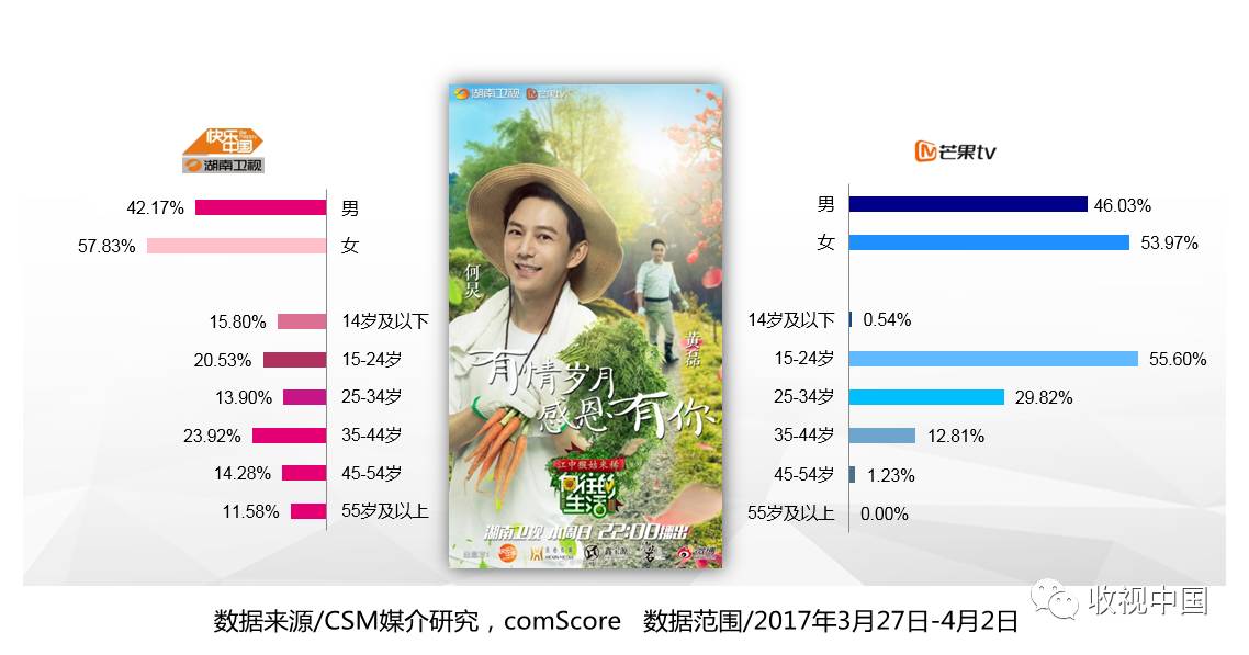 在电视端,《向往的生活》的女性观众比例高于男性,为57.83%;从年龄分布上看,15-24岁和35-44岁的观众为该节目的主要收视人群,分别为20.53%和23.92%;在PC端,该节目在芒果TV的女性观众比例略高于男性,为53.97%,与电视端保持一致;从年龄分布上看,15-24岁为该节目的主要收视人群,为55.60%,与电视端形成差异。