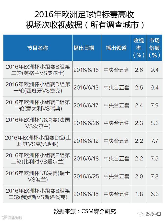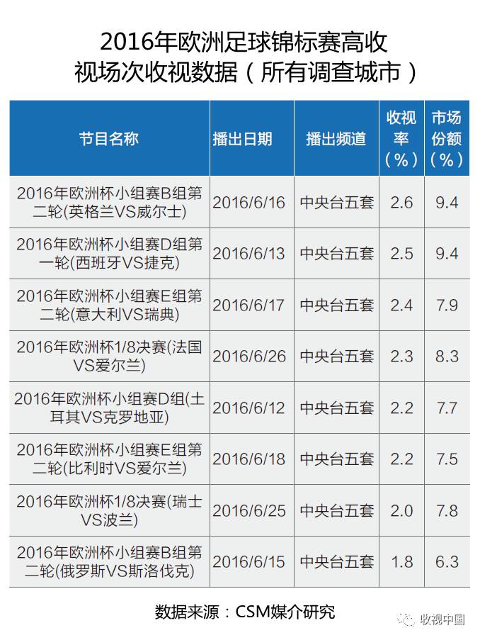 2016年欧洲足球锦标赛于法国当地时间 2016年6月10日至7月10日在法国举行,最终葡萄牙1:0战胜东道主法国队,获得2016年欧洲杯冠军。本届欧洲杯依旧吸引了大量中国足球迷的关注。其中中央台五套6月16日直播的英格兰对阵威尔士一场比赛收视率达到2.6%,市场份额9.4%。除此之外,多场小组赛阶段的比赛都取得了2.0%以上的收视率表现。由于决赛等小组赛之后的比赛播出时段较晚,收视表现整体不如小组赛阶段比赛。