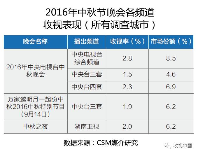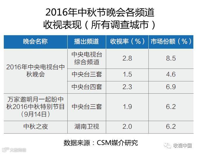 2016年中央电视台中秋晚会在西安大唐芙蓉园紫云楼广场举行,本届秋晚以“回”为主题,中央电视台综合频道、综艺频道、中文国际频道并机直播。三频道合计的总收视率达到6.6%,同时段份额为20.0%。中央台三套的中秋品牌节目《万家邀明月》特别节目提前一天播出,收视率达到1.9%,同时段份额为6.2%。湖南卫视的《中秋之夜》收视率为2.0%,同时段份额为6.2%。整体而言,目前中秋晚会的播出和收视竞争不如元宵晚会激烈。