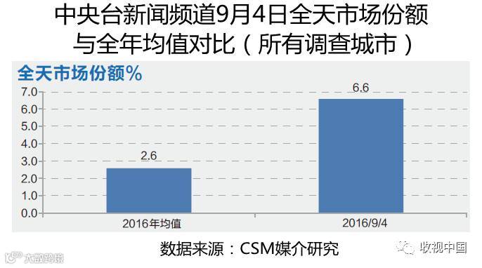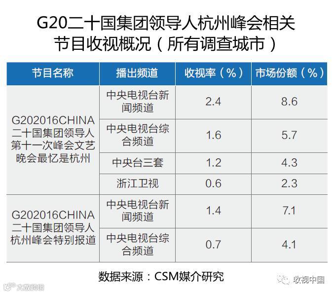 2016中国杭州G20峰会于2016年9月4日至5日在中国杭州召开,峰会主题为“构建创新、活力、联动、包容的世界经济”。中央电视台对本次G20峰会进行了全方位的报道。9月4日晚间播出的文艺晚会《最忆是杭州》引人关注,中央台新闻、综合、三套以及浙江卫视播出的同时段加总收视率为5.8%,同时段份额为20.9%。中央台新闻频道和综合频道从下午13:30开始的新闻特别报道也获得了极大的关注,新闻频道8个多小时的播出平均收视率达到1.4%。新闻频道当天的市场份额也达到全年的峰值6.6%,是该频道全年平均水平的2.5倍。