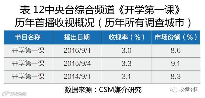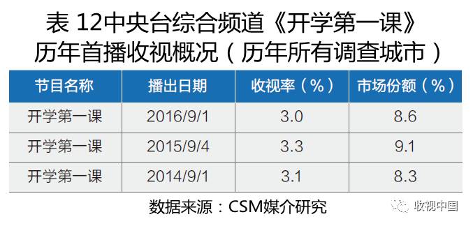 2016年的《开学第一课》以“先辈的旗帜”为主题,围绕“长征精神”,选取青少年的独特视角,带领大家一起重温红色记忆,传承长征精神。中央电视台综合频道2016年9月1日20:00首播时段获得3.0%的收视率,同时段份额达到8.6%。