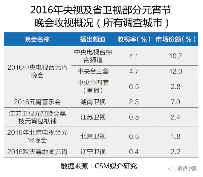 2016年元宵晚会仍然以央视和湖南卫视两家的收视表现较好,但北京卫视、辽宁卫视、江苏卫视、上海东方卫视等多家省级卫视的元宵晚会也逐渐表现出更强的竞争力。其中央视的元宵晚会在中央台综合频道和中央台三套合计的总收视率达到8.9%,同时段份额超过23.3%,保持了前一年的收视水平。中央台四套22:00的重播也获得了0.5%的收视率。湖南卫视的《2016元宵喜乐会》的平均收视率为1.9%。而北京卫视、江苏卫视、辽宁卫视的元宵晚会收视率也提升到0.4%至0.5%的水平。