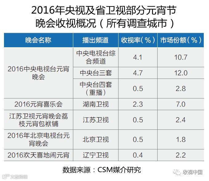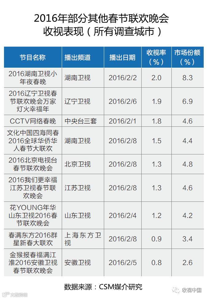 根据CSM全国网收视调查,国内有6.9亿观众通过电视收看了2016央视春晚直播,有1.38亿人在网上收看了春晚直播。央视春晚多屏直播收视率达到30.98%,比2015年的29.53%提高了1.45个百分点。电视直播收视率达到29.94%,比2015年的28.37%提高了1.57个百分点;总收视份额达到71.46%,相对2015年提升2.06个百分点。中央台并机频道总收视率达到17.16%,相对2015年提高2.57个百分点。