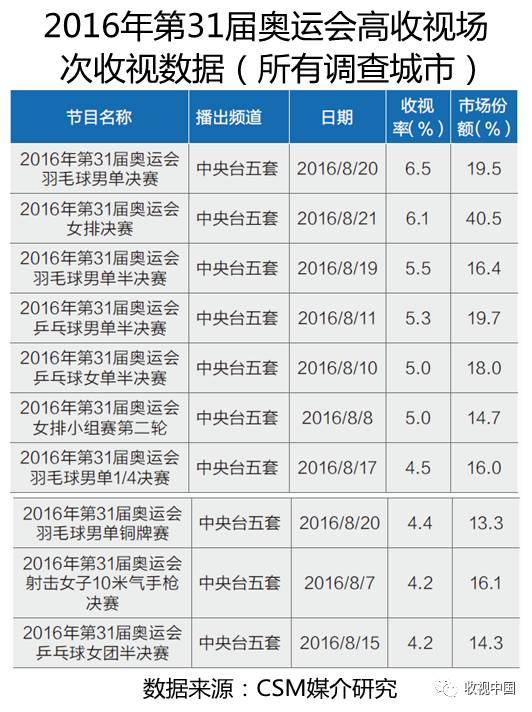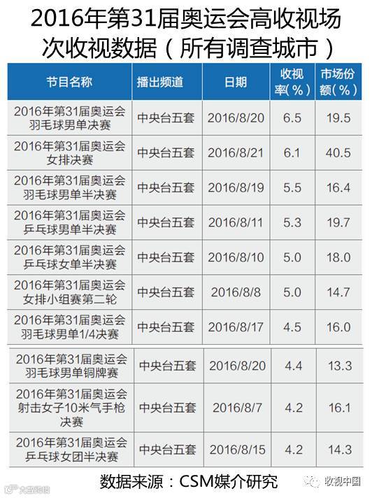 2016年第31届夏季奥运会于2016年8月5日至8月21日在巴西里约热内卢举行。中国代表团最终以26枚金牌、18枚银牌、26枚铜牌,位居奖牌榜前三位。其中羽毛球、排球、乒乓球等中国代表团优势项目最吸引全国观众的关注。羽毛球男子单打谌龙对阵李宗伟决赛场次的收视率达到6.5%,同时段份额19.5%。其他几场林丹参加的羽毛球关键场次也都获得了很高的收视率。中国女排击败塞尔维亚队夺冠一场尽管在上午时段播出,但扣人心弦的赛事依然获得了6.1%的收视率表现,同时段份额达到40.5%。晚间时段播出的男子、女子乒乓球半决赛也都有超高的人气,收视率分别为5.3%和5.0%。