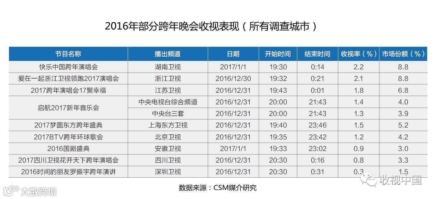 2016年播出跨年晚会的频道仍主要包括中央台、湖南卫视、上海东方卫视、浙江卫视和江苏卫视。其中湖南卫视跨年晚会在2017年1月1日播出,晚会整体收视率为2.2%,领先其他跨年节目。浙江卫视216年12月30日播出的《爱在一起浙江卫视领跑2017演唱会》收视率也达到2.1%,江苏卫视《2017跨年演唱会17聚幸福》在竞争激烈的2016年12月31日播出,收视率为1.8%。同日中央台综合频道和三套并机播出的《启航2017新年音乐会》收视率分别为1.4%和1.3%。上海东方卫视的《2017梦圆东方跨年盛典》的收视率为1.5%,北京卫视《2017BTV跨年环球歌会》的收视率也达到1.2%。四川卫视作为新加入者,其跨年演唱会也获得了0.8%的收视率业绩。深圳卫视跨年演讲节目的收视率为0.3%。2017年1月1日安徽卫视播出的《国剧盛典》收视率为0.9%。