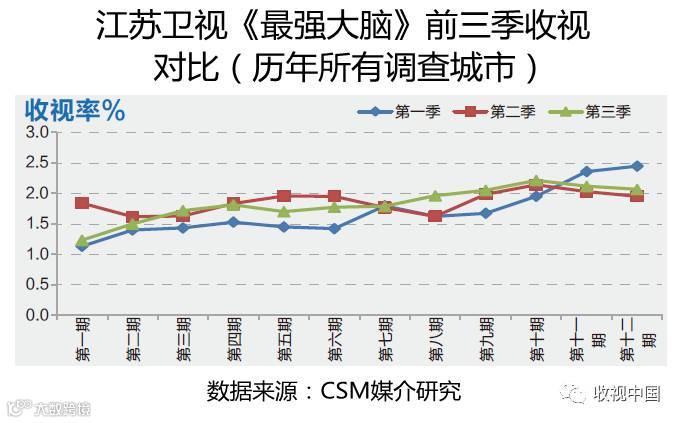 大型科学竞技真人秀《最强大脑》第三季于2016年1月8日起每周五21:00在江苏卫视首播,于2016年4月1日收官。《最强大脑》第三季12期节目平均收视率为1.8%,同时段份额为6.2%,整体收视表现与第二季相当。
