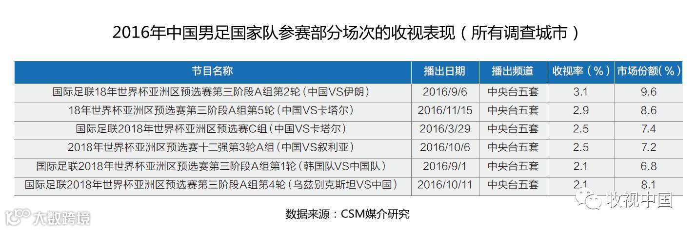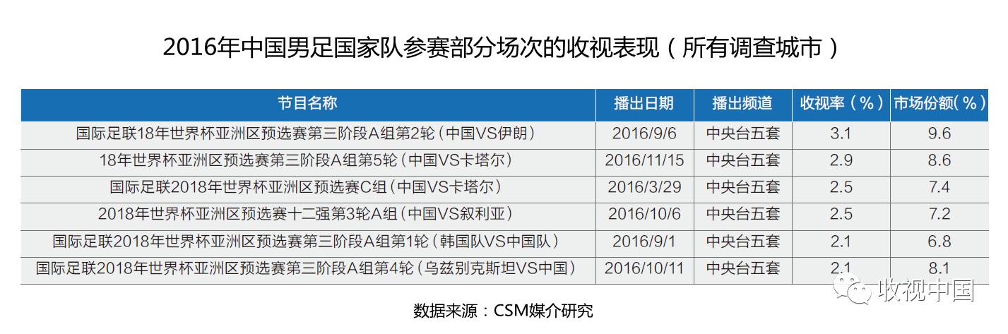 2016年是2018年世界杯预选赛亚洲区的重要比赛年份,其中多场中国男足国家队参加的比赛牵动着球迷的心。中央台五套2016年9月6日直播的十二强赛第二轮中国队对阵伊朗队一场比赛的收视率达到3.1%,市场份额为9.6%,成为当年收视率最高的足球赛事。该场比赛前后的另外四场十二强赛以及预选赛C组最后一场也都取得了2.0%以上的收视率表现。